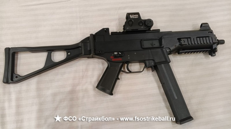 Комплектация: привод, магазин, шомпол, 2 пакета шариков, 2 АКБ, зарядное устройство для АКБ, чехол "Бункер". Возможно доукомплектовать коллиматорным прицелом Zombie Stropper, в этом случае с прицелом цена - 27000 руб. Автомат покупал очень давно, неделю пострелял с сыном по мишеням на даче, после чего положил в шкаф. G&G UMG — страйкбольный автомат, пневматическая реплика немецкого пистолета-пулемёта UMP 45 от компании Heckler and Koch. Калибр: 6,0 мм (.236). Принцип действия: AEG (электропневматическое). Источник энергии: аккумулятор, разъём mini Tamiya. Тип гирбокса: Ver. 2. Дульная энергия: до 3 Дж. Боеприпасы: шарики 6 мм. Тип магазина: бункерный. Скорость выстрела: 110–120 м/с. Hop-up: есть, регулируемый. Подшипники: 8 мм втулки. Материал: ABS-пластик, металл. Цвет: чёрный. Режим стрельбы: полуавтоматический / автоматический. Планка Weaver / Picatinny: есть, RIS.